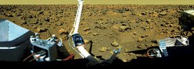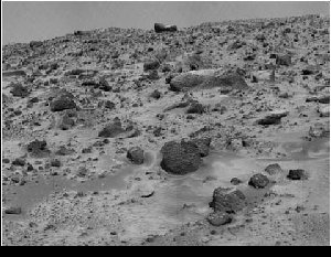 Μια τυπική είκόνα της επιφάνειας του Αρη. Οι πέτρες που βλέπετε έχουν πιθανότατα εκτοξευθεί κατά τις προσκρούσεις που δημιούργησαν τους κρατήρες. Η κοκκινωπή όψη της επιφάνειας οφείλεται στην παρουσία οξειδωμένου σιδήρου. Το ροζ χρώμα του ουανού οφείλεται στην εξαιρετικά λεπτή άμμο που βρίσκεται στην ατμόσφαιρα του Αρη.