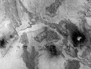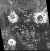 | Στη φωτογραφία φαίνονται τρεις μεγάλοι κρατήρες, με διαμέτρους που ποικίλουν από 37 ως 65 km, καθώς επίσης διακρίνονται και μικρότεροι κρατήρες πιθανώς προερχόμενοι από συγκρούσεις με μετεωρίτες. Οι πυθμένες των κρατήρων φαίνονται σκοτεινοί επειδή είναι σχετικά λείοι και έχουν καλυφθεί με λάβα, που μάλλον προέρχεται από σχηματισμούς διαμέτρου 1-12 km που μπορείτε να δείτε βορειοανατολικά της εικόνας. | ![]() |