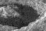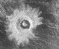 Κρατήρας GolubkinaΣτη φωτογραφία φαίνεται ο κρατήρας Golubkina ,που πήρε το όνομά του από τη Ρωσίδα γλύπτρια Anna Golubkina, σε μια φωτογραφία από το διαστημόπλοιo Μαγγελάνο. Ο κρατήρας έχει διάμετρο 30 Km και χαρακτηρίζεται από χωμάτινα τοιχώματα και την κεντρική κορυφή, που έιναι άλλωστε τυπική στους κρατήρες της Γης, του Άρη και της Σελήνης. Τα χωμάτινα τοιχώματα δημιουργήθηκαν από την κατάρρευση του εδάφους λόγω της πτώσης του μετεωρίτη. Στη δεύτερη φωτογραφία φαίνεται μεγέθυνση του κρατήρα από υπολογιστή κατά 20 φορές. |